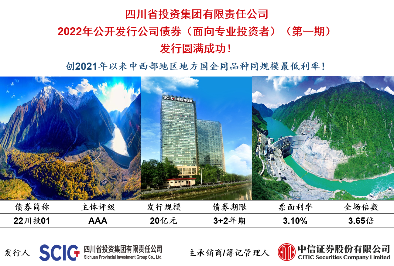 4月6日,川投集團(tuán)2022年公司債券(面向合格投資者)(第一期)在上海證券交易所成功發(fā)行。本期公司債券發(fā)行規(guī)模20億元,債券期限3 2年,發(fā)行票面利率3.10%,低于央行長期限LPR定價150個BP,創(chuàng)2021年以來中西部地區(qū)地方國企同品種同規(guī)模最低利率,同時創(chuàng)川投集團(tuán)有史以來中長期債券利率新低,債券存續(xù)期間可累計為企業(yè)節(jié)省利息支出約15,000萬元。