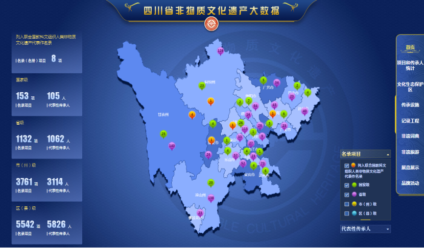 “四川省非物質(zhì)文化遺產(chǎn)大數(shù)據(jù)”平臺以數(shù)字化方式記錄、保存和展示四川非遺資源,從前端界面、后端管理系統(tǒng)、數(shù)據(jù)庫遷移上云等方面進(jìn)行了全方位設(shè)計,以可視化方式集中展示了四川非遺的圖文影音資源、地域分布、多維度統(tǒng)計數(shù)據(jù)。該平臺涵蓋代表性項目、代表性傳承人、傳承設(shè)施等基礎(chǔ)數(shù)據(jù),此外,還囊括了記錄工程、文化生態(tài)保護(hù)區(qū)、非遺詞典、非遺旅游、展覽展示、輿情管理等重要非遺保護(hù)工作成果,為非遺保護(hù)工作者提供專業(yè)的信息和服務(wù),為廣大觀眾更好地了解非遺提供了窗口。