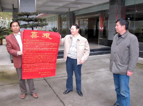 (左二)從葛洲壩項目部經(jīng)理劉勇(右一)手中接過喜報。
