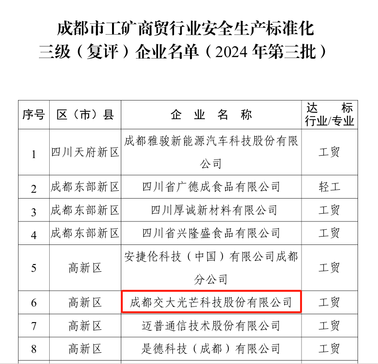 2024年9月,成都市應(yīng)急局發(fā)布《關(guān)于公布成都市工礦商貿(mào)行業(yè)安全生產(chǎn)標(biāo)準(zhǔn)化三級(jí)(復(fù)評(píng))企業(yè)名單(2024年第三批)的通知》,川投能源所屬交大光芒通過(guò)安全生產(chǎn)標(biāo)準(zhǔn)化三級(jí)達(dá)標(biāo)復(fù)評(píng)。