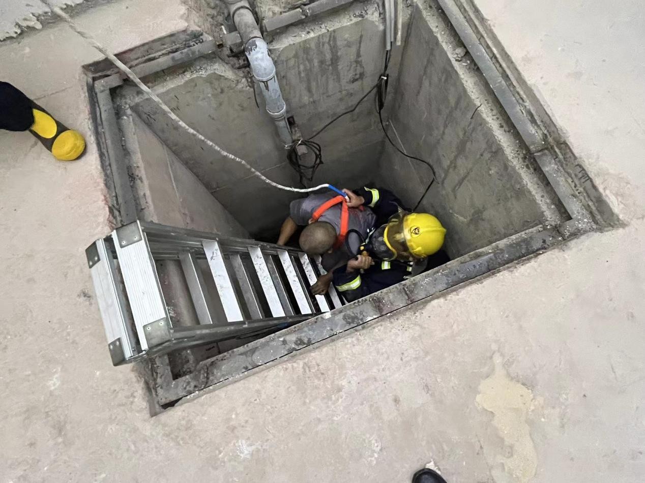 本次演練共分為檢測組、現(xiàn)場作業(yè)組、應(yīng)急救援組、治安維護組、醫(yī)療救護組五組人員。演練模擬一名維修人員,為檢查污水井水泵故障情況,在未佩戴防毒面具的情況下,下至集水坑底部,導(dǎo)致吸入過量有害氣體,昏倒在坑底,急需救援?,F(xiàn)場作業(yè)組立即將事故情況上報,啟動預(yù)案開展應(yīng)急救援。