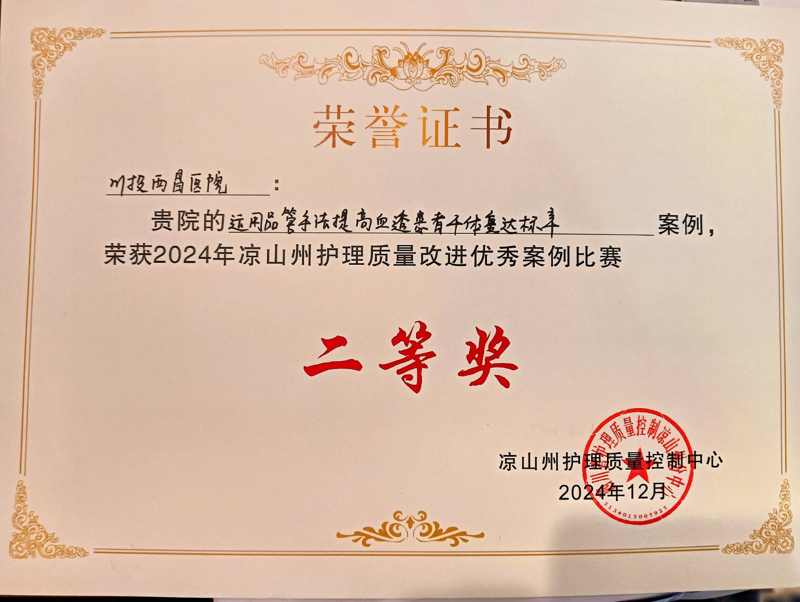 12月8日,涼山州護理質(zhì)控中心舉辦“涼山州護理質(zhì)量改進案例比賽”,本次大賽聚焦于改善醫(yī)療質(zhì)量、優(yōu)化護理服務以及強化患者安全等核心議題,旨在深度挖掘和推廣護理領域的創(chuàng)新實踐與卓越成果,共有來自涼山州各市(縣)護理質(zhì)控中心選送的17個案例作品參加角逐,川投西昌醫(yī)院王亞玲、范曉迪的案例作品榮獲比賽“二等獎”,可喜可賀!