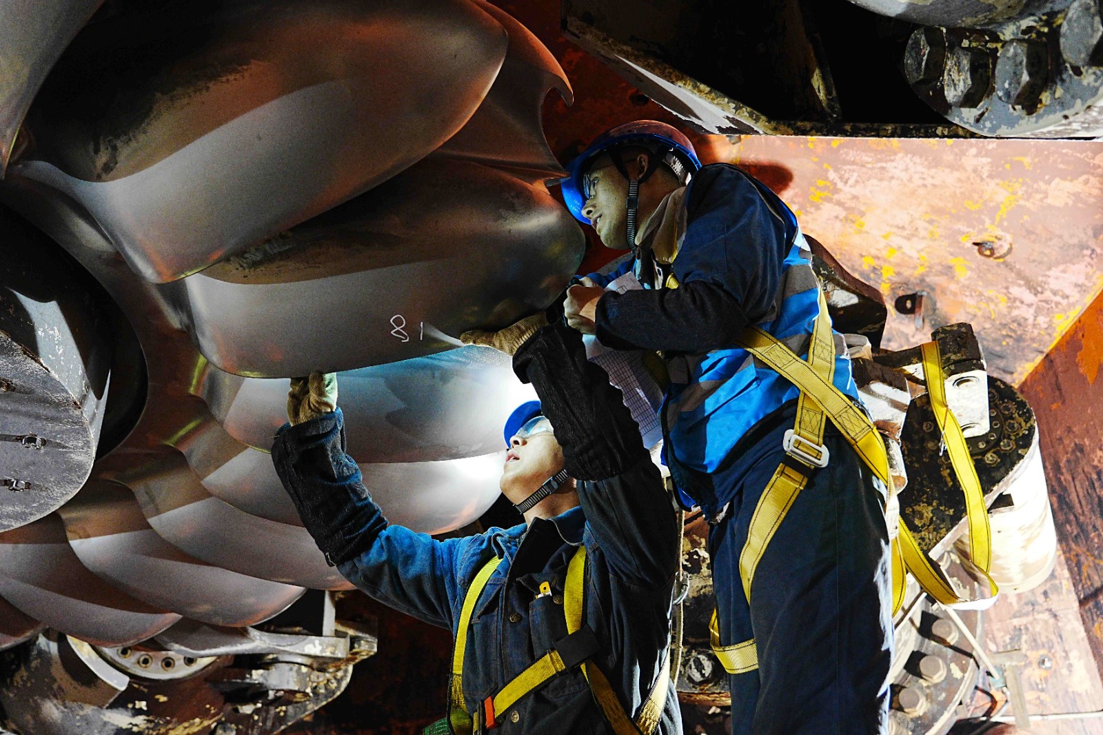 連續(xù)奮戰(zhàn),展現(xiàn)擔當。為保證汛后檢修工作保質(zhì)保量按時完成,公司提前做好“排兵布陣”,專業(yè)骨干及新進員工在設(shè)備改造、轉(zhuǎn)輪更換等檢修作業(yè)高峰期紛紛調(diào)整休假,連續(xù)奮戰(zhàn),全力保障檢修工作順利進行。檢修作業(yè)現(xiàn)場,既有經(jīng)驗豐富、技術(shù)精湛的檢修骨干,也有朝氣蓬勃的年輕一代,新老兩代檢修人員相互協(xié)作、相互學(xué)習(xí),彰顯責(zé)任擔當?shù)耐瑫r,傳承著屬于田灣河的技術(shù)經(jīng)驗與精神文化。